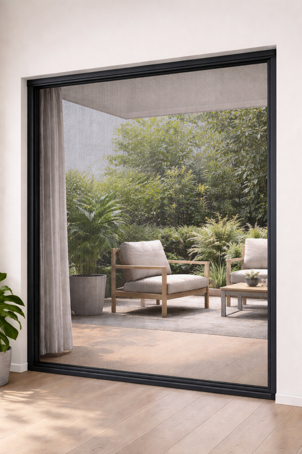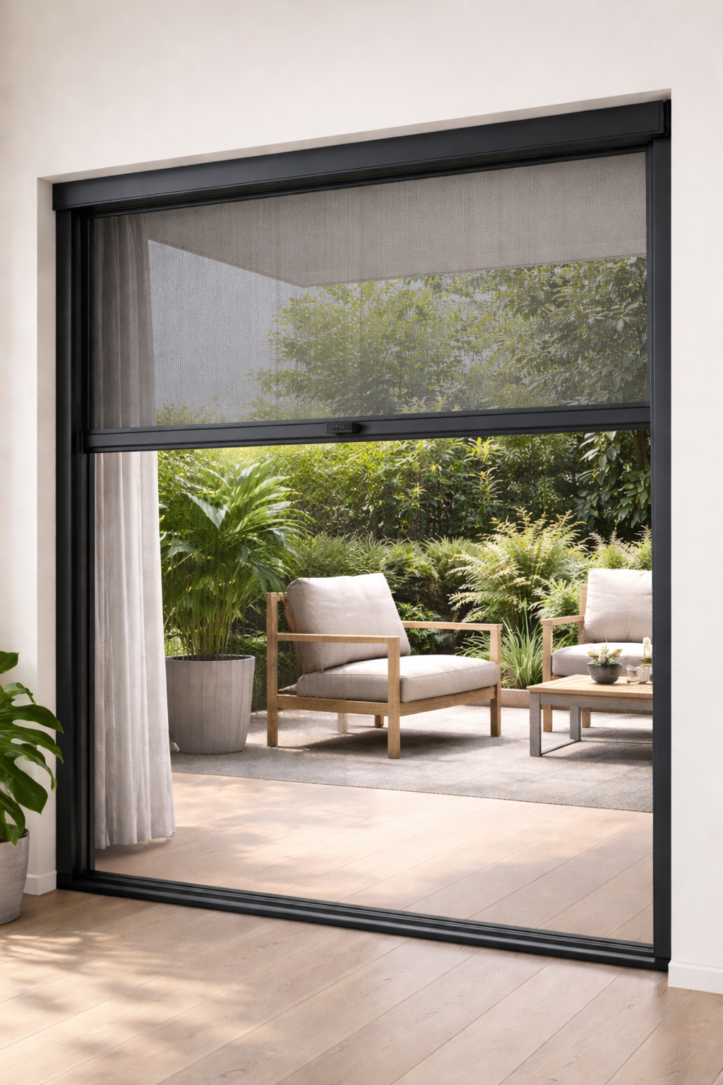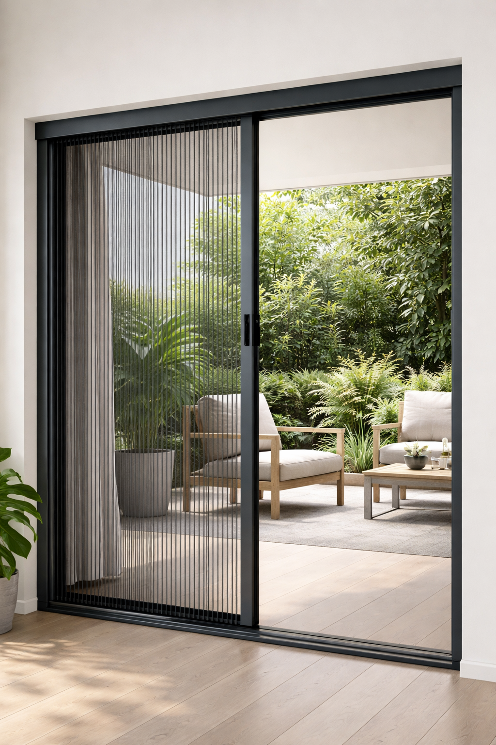 Les moustiquaires plissées, esthétiques et souples, se glissent latéralement sur des rails pour une ouverture facile, idéales pour les grandes ouvertures comme les baies vitrées